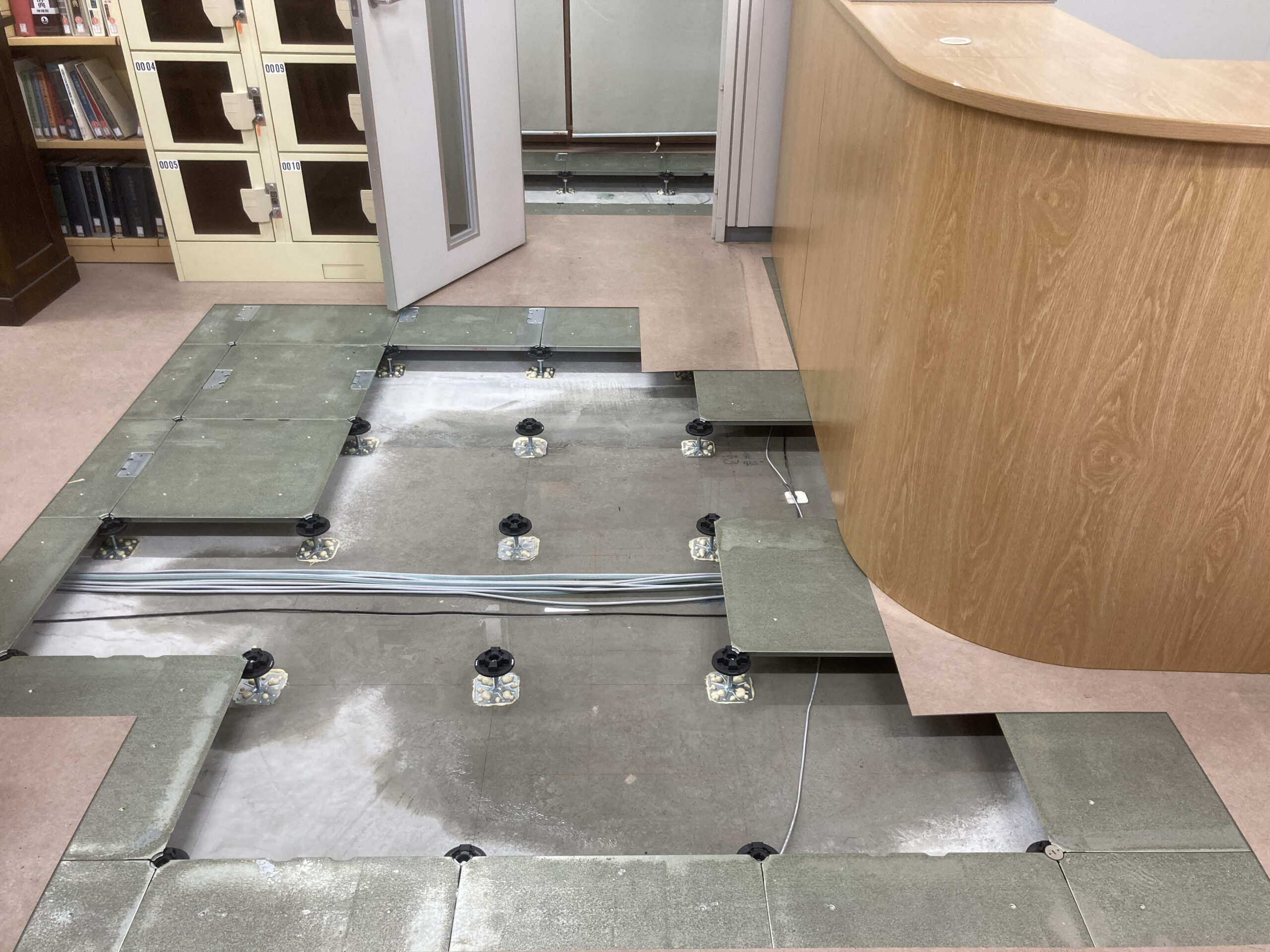 漏水被害を受けた部分の床構造がOAフロアであることから、床板を外した上で流入した水の除去と乾燥に時間を要する見込みです。開室時期は現在のところ未定ですが、早期の復旧に努めて参ります。